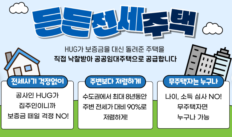 '내 집 마련'은 하고 싶은데 요즘 부동산 관련 전세 사기, 사건, 사고 소식이 자주 들려오면서, 전세 계약을 앞두고 걱정하는 분들이 많아졌어요. 그런 분들을 위한 든든한 선택, 바로 <든든전세>입니다. 오늘은 든든전세가 무엇인지, 어떤 혜택이 있는지, 그리고 누가 어떻게 신청할 수 있는지까지 꼼꼼히 알려드릴게요. 저를 믿고 따라와 보실까요?